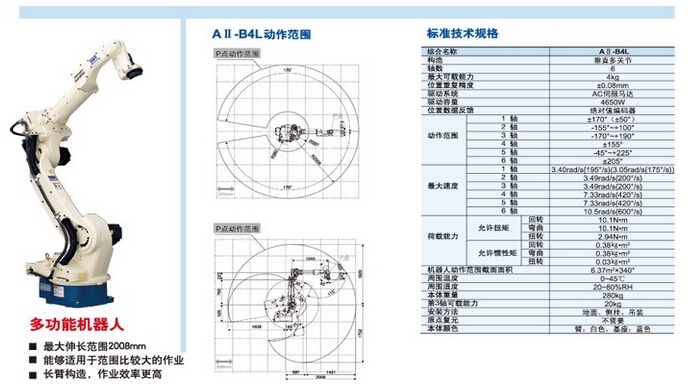 OTC弧焊機(jī)器人有兩種常用規(guī)格:同軸電纜內(nèi)置式AⅡ-B4和電纜外置式AⅡ-V6;按機(jī)器人焊接工作范圍分,以上兩種規(guī)格的都有標(biāo)準(zhǔn)型工作半徑1400毫米和2000毫米,稱之為AⅡ-B4L(加長型)和AⅡ-V6L(加長型).
